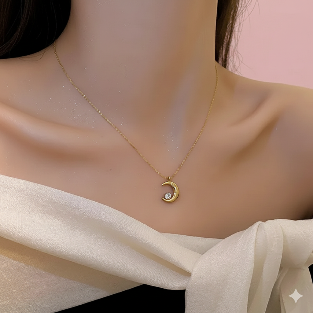 An elegant gold-plated necklace featuring a smooth crescent moon pendant, beautifully inlaid with a sparkling zircon stone. Crafted from durable 304 stainless steel for lasting celestial charm.