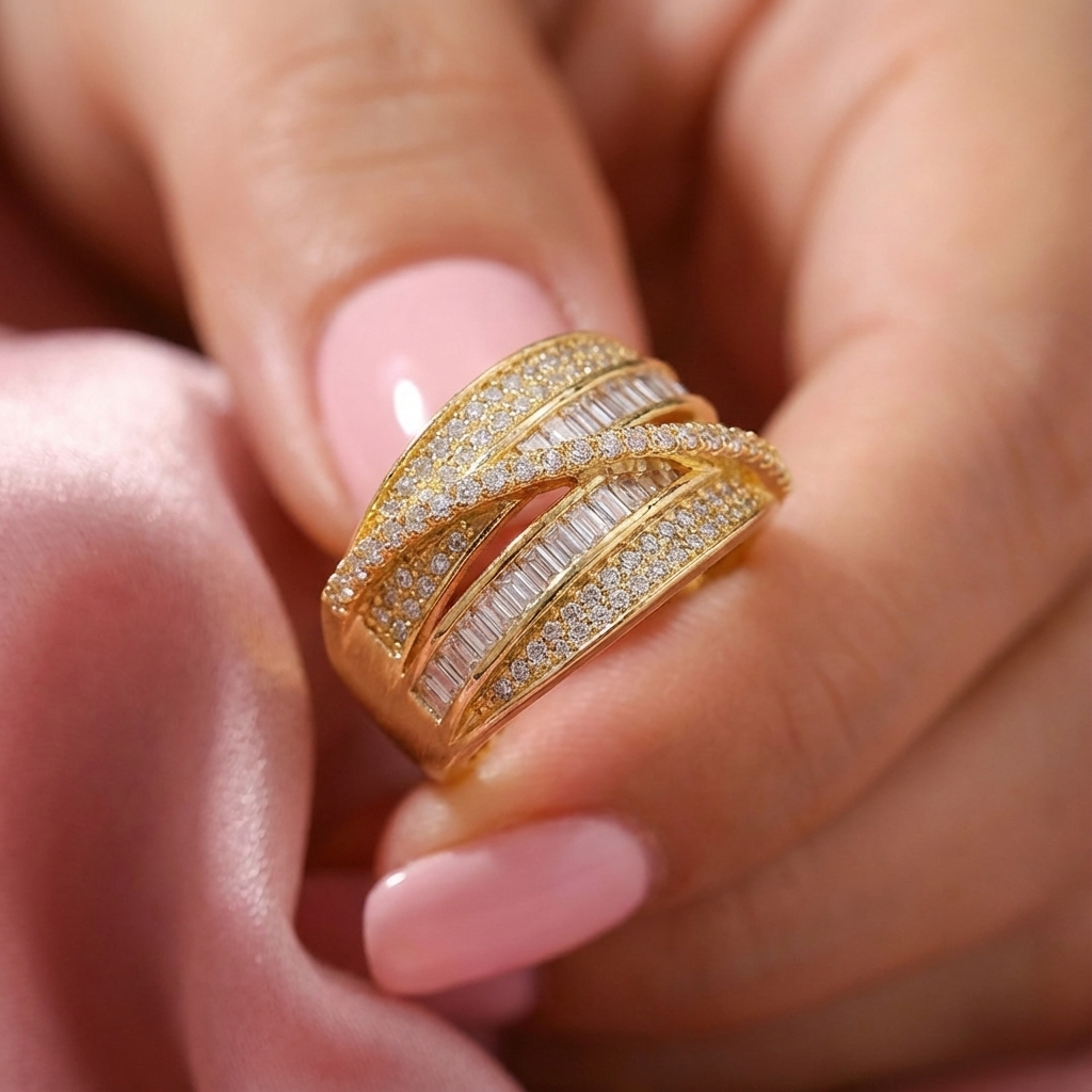 A dazzling, multi-band statement ring featuring geometric metalwork and brilliant zircon inlays. Glamorous, Zircon, Multi-Layer.