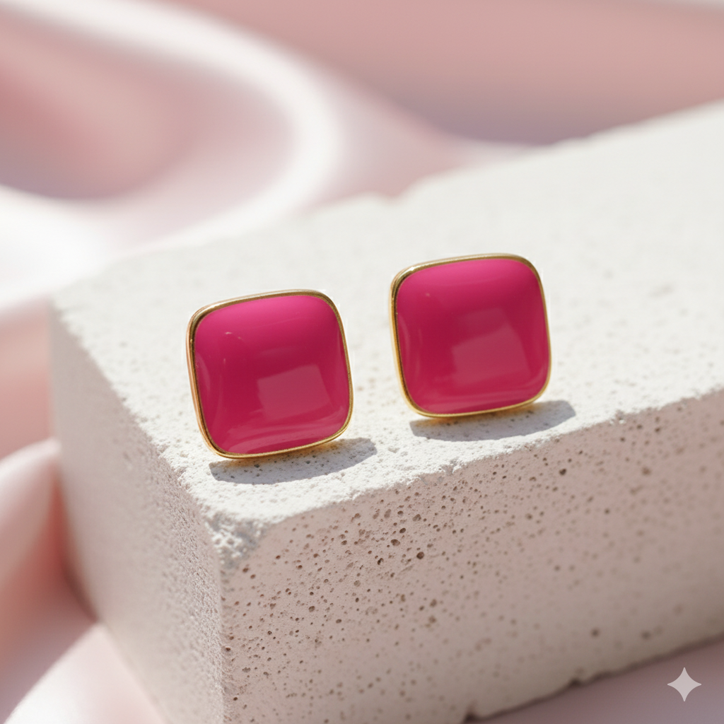 Vibrant, fashionable stud earrings featuring a chic square shape coated in a glossy, rose pink enamel finish. The perfect pop of color for your outfits.