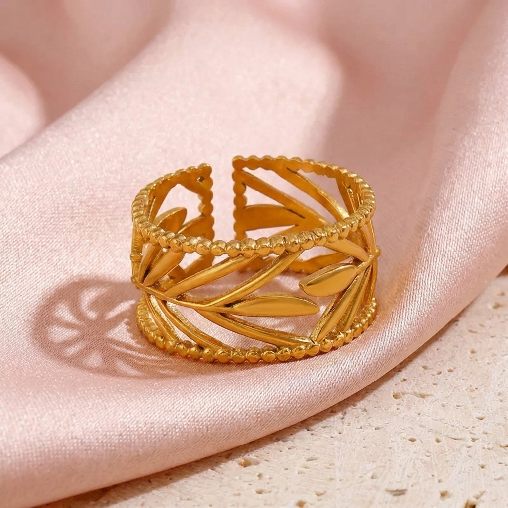 A beautiful, wide open band ring featuring intricate laurel leaf cutouts and a textured beaded edge. Made from waterproof, non-tarnish 304 stainless steel with 18K gold plating for an elegant, durable finish.