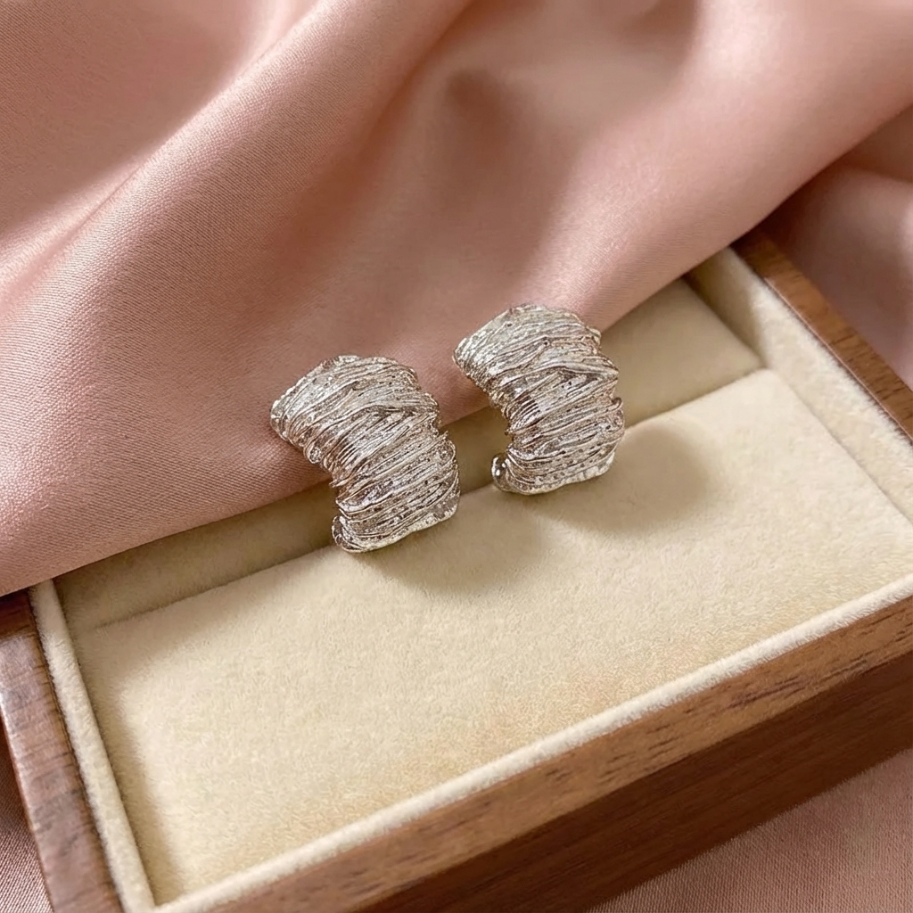 Elegant and unique, these silver-toned stud earrings feature a striking layered, ruffled texture that catches the light beautifully. Their bold shape and intricate detailing offer a refined, contemporary statement.